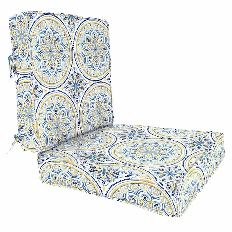Our outdoor cushions are durable and ready to stand up to the elements. Polyester construction and all-weather capability make this 2-Piece Castille multicolor gusseted outdoor deep seat cushion set is a must-have for outdoor entertaining. With the fashion-forward design, you can create a stunning patio, porch or deck that will be the talk of the neighborhood. Check our overall selection for a variety of shapes, sizes, patterns and colors to fit the personality of your patio.