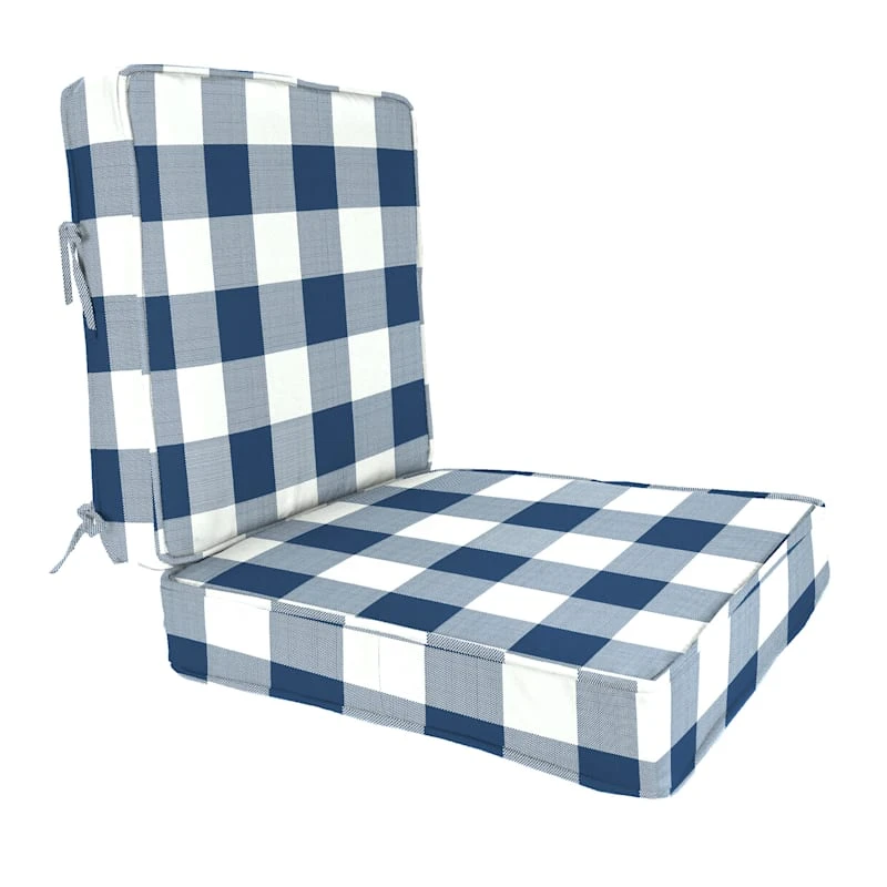 Make moments enjoying the great outdoors even more pleasing with our 2-Piece Navy Blue Buffalo Plaid Outdoor Gusseted Deep Seat Cushion Set, perfect for boosting the comfort and style of your favorite outdoor spaces. Create a stunning patio, porch or deck that will be the talk of the neighborhood. Check our overall selection for a variety of shapes, sizes, patterns and colors to fit the personality of your patio.