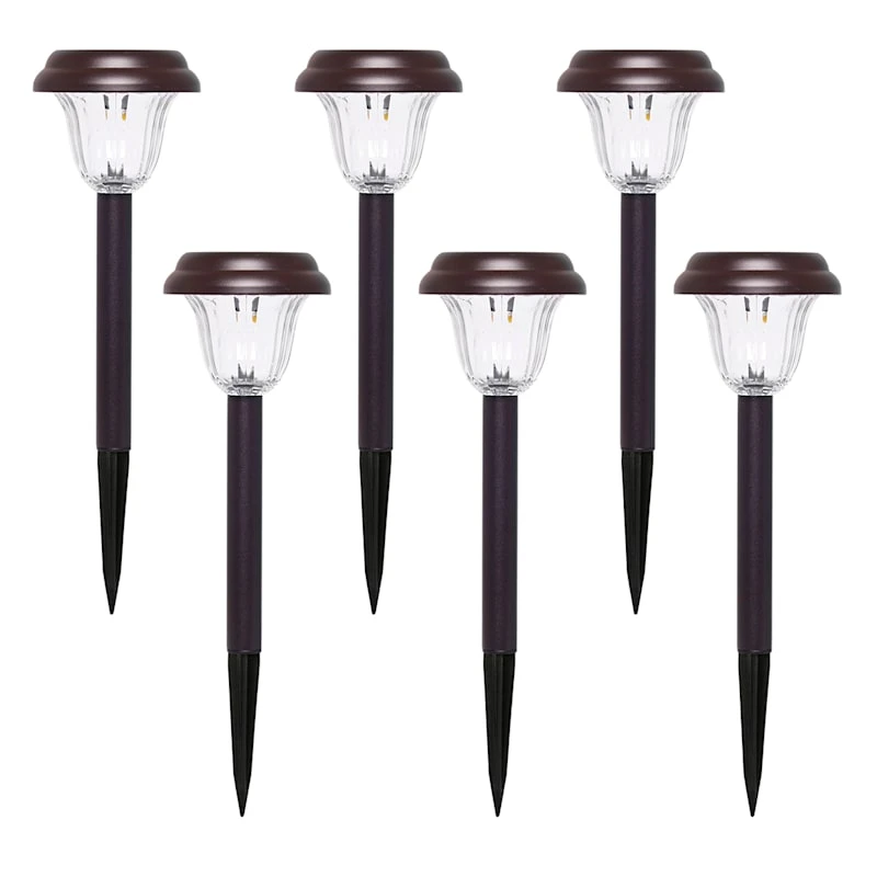 Our 6-pack decorative outdoor Melville brown metal solar pathway light set shines softly for mood lighting in your garden, on the patio or balcony. Each traditional 5-Lumen outdoor lantern light comes with a stake, which can insert into patio pots, the garden and around the lawn. Lamps are made of brown metal and plastic and are very durable, ready to stand up to the elements. Decorative lanterns can be placed just about anywhere, decorating your environment when you’re entertaining, camping, fishing, and so much more.