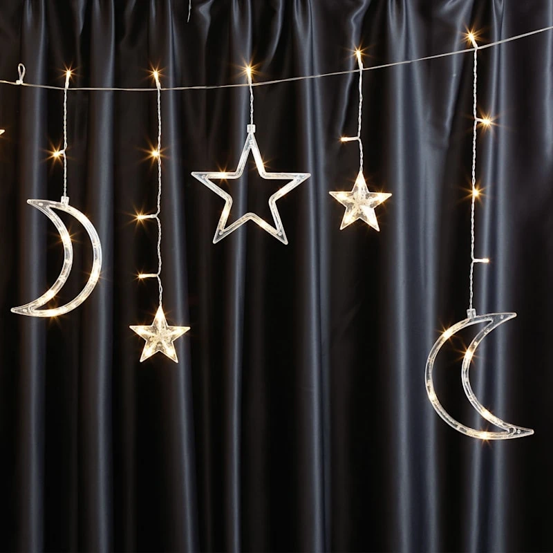Set the perfect mood year-round with our 66-count LED moon and star drop twinkle lights! Its warm glow adds fun and excitement to any indoor space. With a 6-foot white wire, these lights are easily hung around a room and the safety fuse plug and durable coordinating wire will keep it shining for seasons to come.