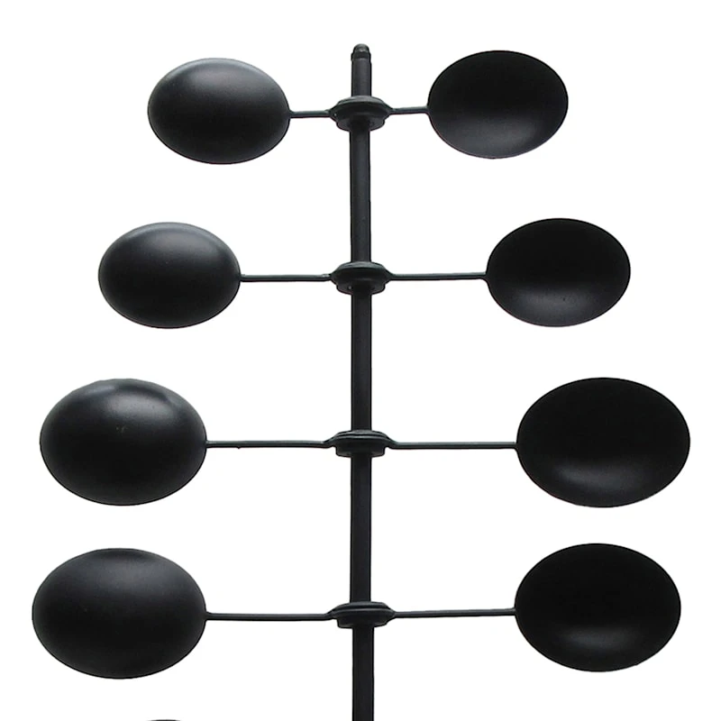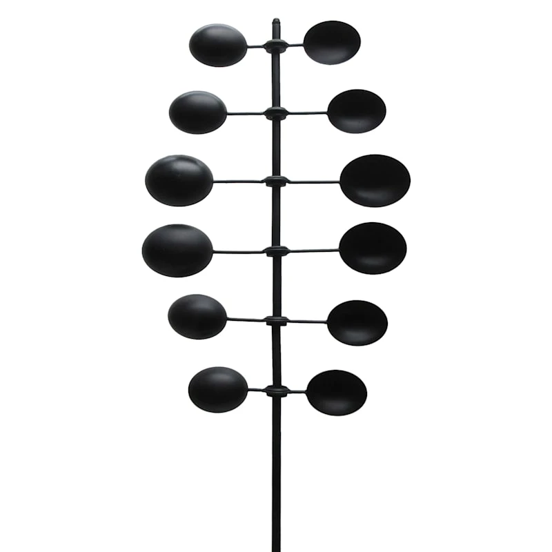 Add a pinch of fun to your garden with our colorful metal 48in. black spin wind sculpture outdoor garden stake. Created with love, this detailed metal piece features a spiked base with a modern cupped disc design. Everyone will enjoy the charming subject matter tucked into your prolific garden. Made of rust-resistant metal, this garden stake is designed to bring an illuminated touch to your landscaping.
