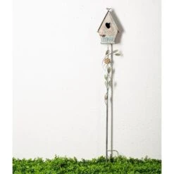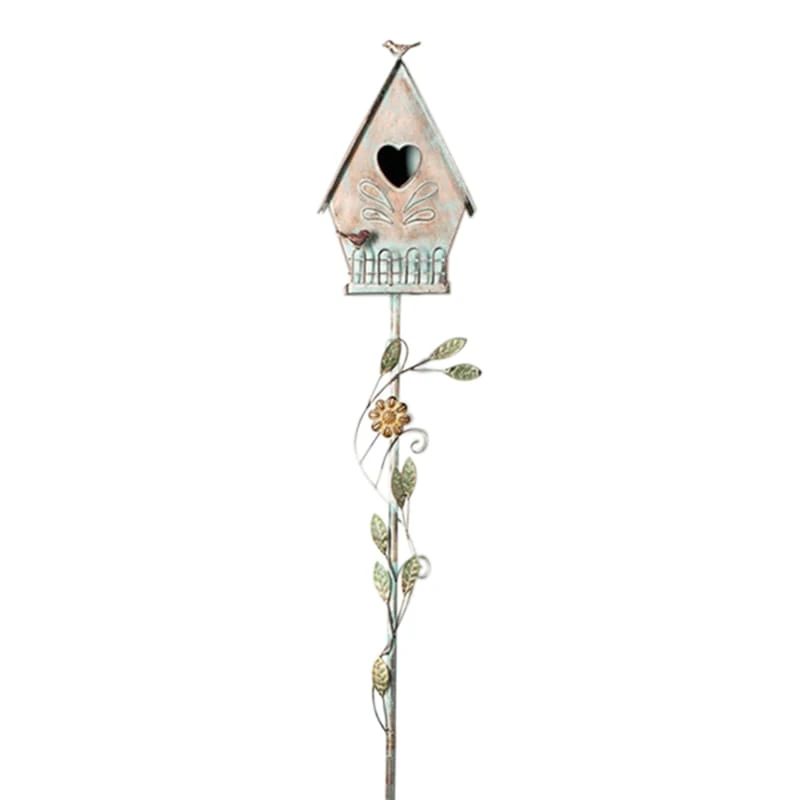 Add a touch of whimsy to your yard with our birdhouse garden stake. Created with love, this detailed metal decor features a spike pole with a green and copper coloration with floral vine, bird and fence motif. Everyone will enjoy the charming birdhouse tucked into your prolific garden. Made of rust-resistant metal.