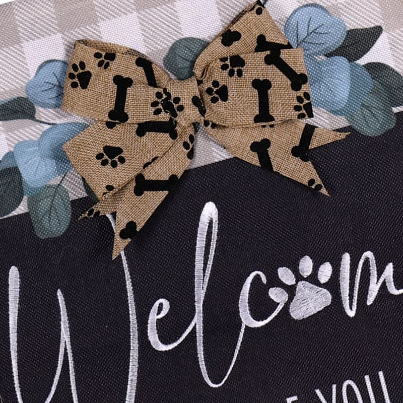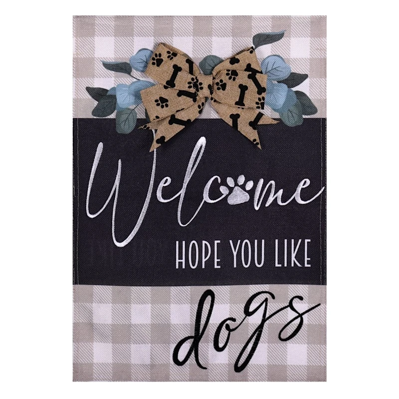 Welcome visitors into your home with our fun “Welcome. Hope you like dogs” checks garden flag. Featuring a neutral outdoor motif, this welcome sign is a great way to greet your guests. The wonderful multicolor checkered and doggie print bow detailing is a nice pop to help get the warm days ahead started. This is the perfect spring or summer decoration to welcome in the new season and guests, too.