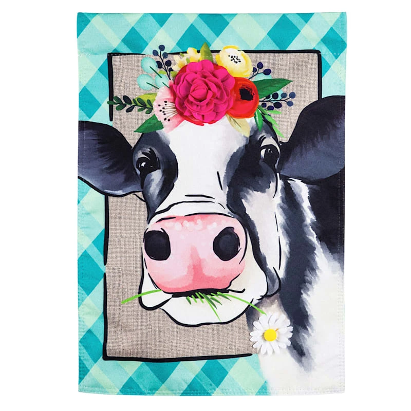 Welcome visitors to your home with our whimsical floral crowned cow garden flag. Featuring a colorful plaid motif, this banner is the perfect spring or summer yard decoration.