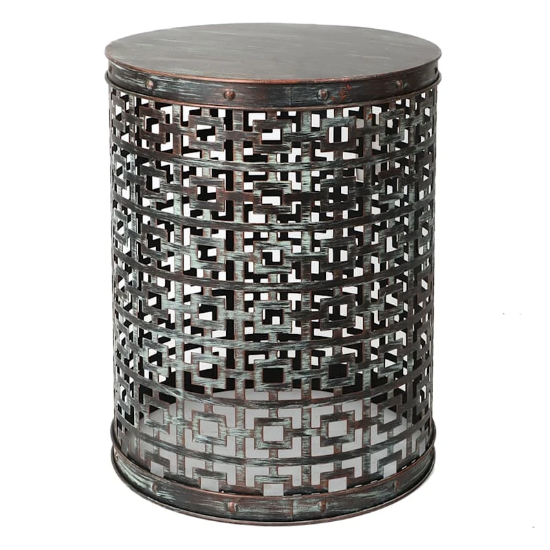 Found & Fable is a new collection that lets you explore what’s right around the corner. Choose your own adventure every day. Savor it all and say yes to what comes next—exclusively At Home. This handy large 18in. punched metal plant stand works as a display piece or as a spare seat to in your garden room or patio, or it’s the perfect place to set your drink and nibbles while visiting. Made from weathered look metal with a barrel silhouette and faux tarnish finish. An allover cutout design gives it loads of personality. The stool is designed with a linked box cutout motif that’s sure draw attention.