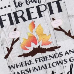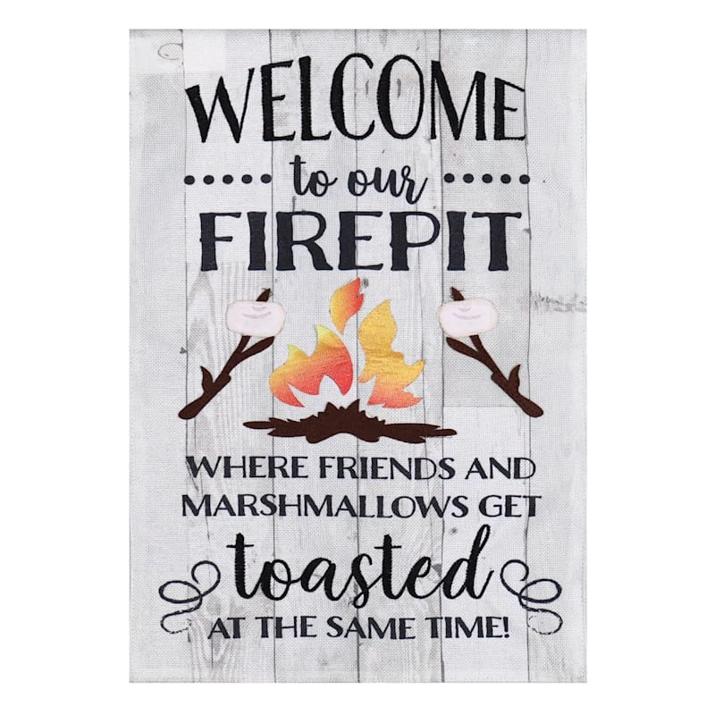 Welcome visitors into your home with our whimsical “Welcome to our Firepit Where Friends and Marshmallows get toasted all the time” garden flag. Featuring a multicolor outdoor motif, this welcome sign is a great way to greet your guests and offer a little laugh at the same time. The wonderful marshmallow toasting, and wood slat details are a nice pop to help get the warm days ahead started. This is the perfect spring or summer decoration to welcome in the new season and guests, too.