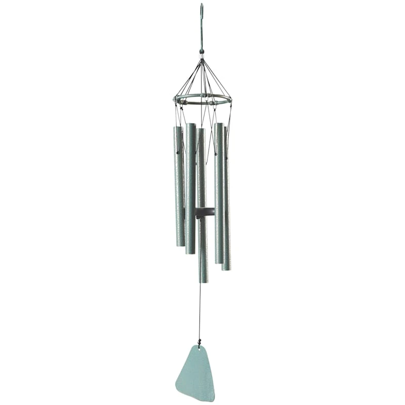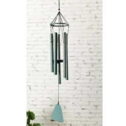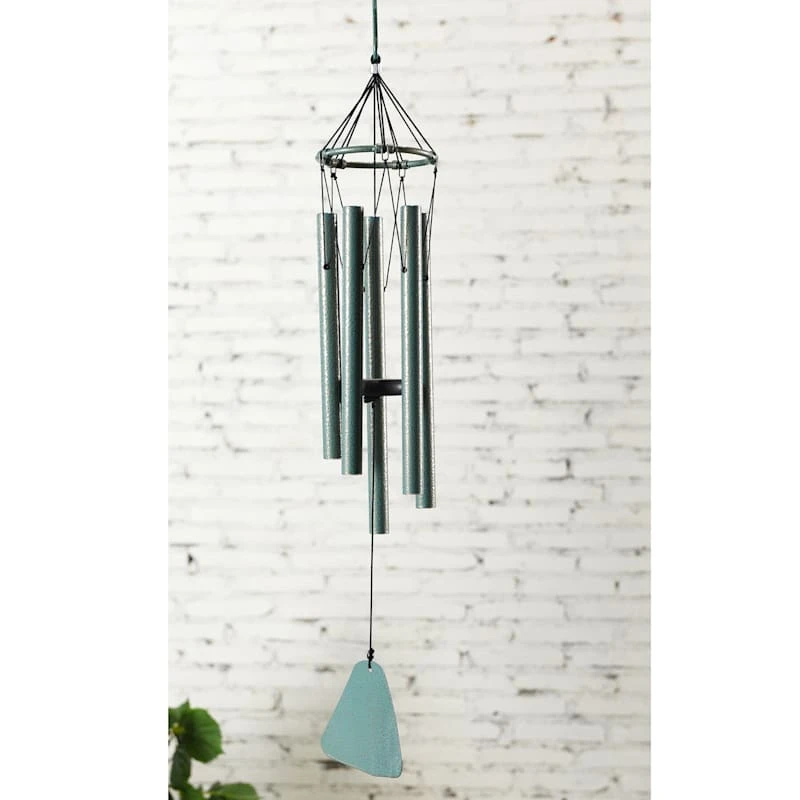 Featuring a greenish tubular silhouette, our 34in. tiered metal wind chimes create a clear and graceful sound. Wind chimes are symbolic of serenity and tranquility and are also thought to bring luck to whomever listens to them. The perfect gift for the outdoor lover.