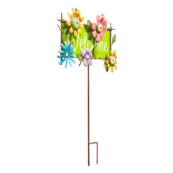 Add bright whimsy to your yard with our colorful floral welcome garden stake. The sign features a colorful array of 3-D flowers that welcome you in. Stakes easily into the ground anywhere in your yard or garden, or you can add it to a grouping of flower pots for an even more spectacular display.