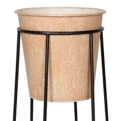 Modern farmhouse meets At Home prices in Honeybloom, our exclusive new brand that celebrates life lived together. Highlight your green thumb and showcase your annuals and perennials at your front door or add a touch of festive foliage to your deck with our stylish 24in. peach metal and a circular black wire metal stand. More than just a spot to display your gardening skills, this modern pot has a contemporary appearance with its wonderful elevated design. Created to live indoors or covered outdoors, it’s ready to make your plants pop.