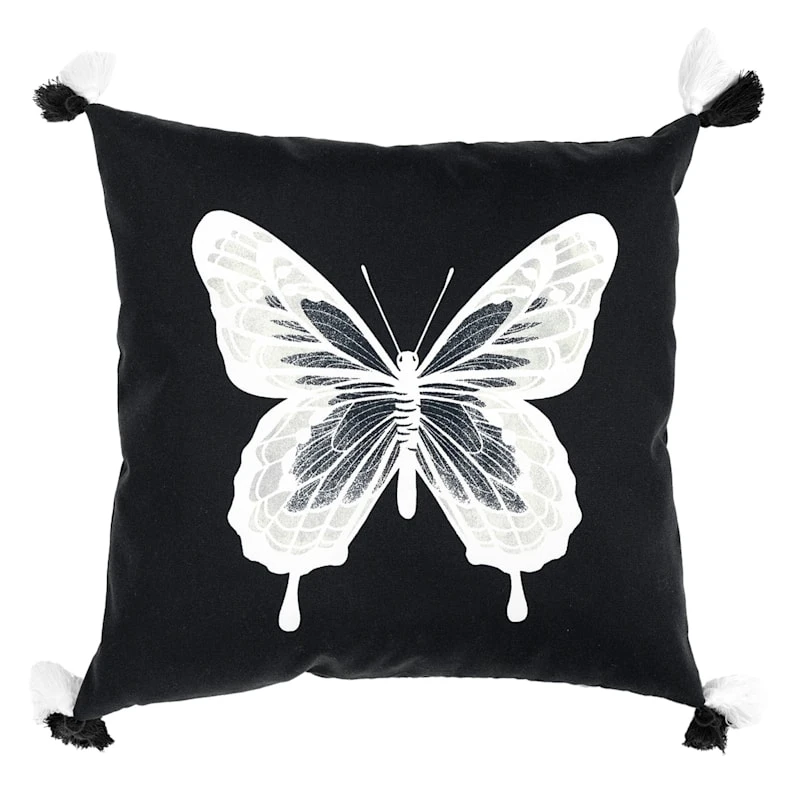 Laila Ali brings the mindset of a world-champion athlete and passion for healthy living to create a modern lifestyle collection with serious style found only At Home. Give your living room or patio a touch of sumptuous texture with our 18in. square black and white butterfly throw pillow. Showcasing an understated neutral hue, the black and white polyester cover is finished with two-tone tassel details on each corner for a special look.
