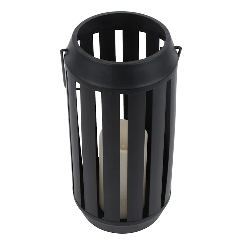 Laila Ali brings the mindset of a world-champion athlete and passion for healthy living to create a modern lifestyle collection with serious style only found At Home. Our black slat 13in. metal lantern features a unique tight stripe design that complements the candlelight inside. A realistic LED with gives the bulb a true shimmer for a light that warms any space, and the movable handle makes it easy to hang wherever you want some additional glow.
