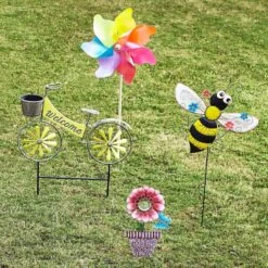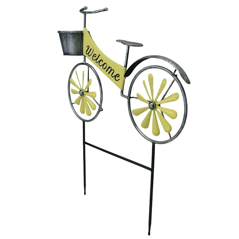 Add a pinch of fun animation to your garden with our metal bicycle garden stake. Created with love, this detailed metal piece features a front basket and welcome sign. Everyone will enjoy the yellow spinning bicycle spokes as they whirl away in the wind. Made of rust-resistant metal, this garden stake is designed to look like a classic bike wheeling through your garden.