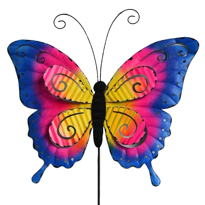 Add a pinch of fun to your garden with our colorful metal 21in. butterfly outdoor garden stake. Created with love, this detailed metal piece features a double spike base with a detailed butterfly design. Everyone will enjoy the charming subject matter tucked into your prolific garden. Made of rust-resistant metal, this garden stake is designed to bring an illuminated touch to your landscaping.