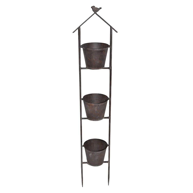 Add a joyful symbol of summer to your yard with our rustic metal tiered planter garden stake. Strong and durable, this beauty is crafted of weathered metal and features 3-tier pot planters and a bird finial on top. Use this stake as an accessory in your garden or front yard as a bright seasonal welcome.