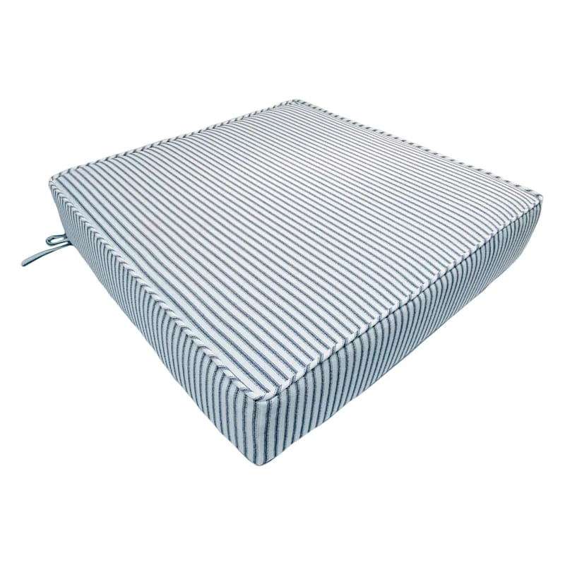Our outdoor cushions are durable and ready to stand up to the elements. Polyester construction and all-weather capability make this Navy Blue Ticking Striped Outdoor Gusseted Deep Seat Cushion a must-have for outdoor entertaining. Create a stunning patio, porch or deck that will be the talk of the neighborhood. Check our overall selection for a variety of shapes, sizes, patterns and colors to fit the personality of your patio.