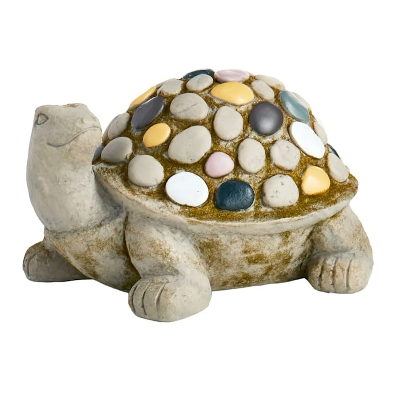 Enjoy your outdoor living areas a little bit more with our handmade resin garden turtle decor. Made of durable resin, this figurine is perfect for outdoors. The garden sculpture features a wonderful multicolor pebble/rock motif on his shell. The peaceful sight of this garden visitor is sure to help tie your serene garden theme together.