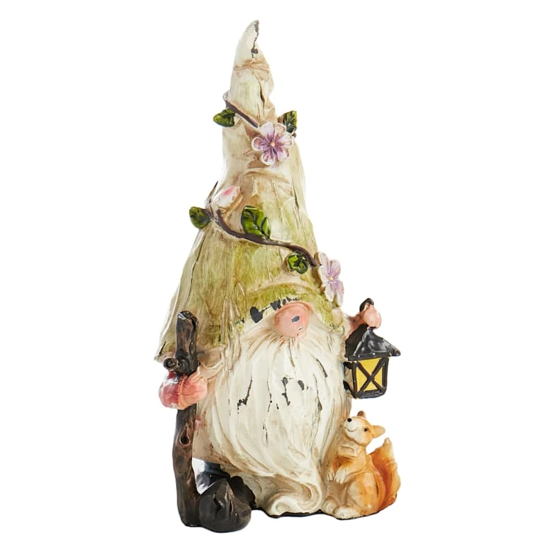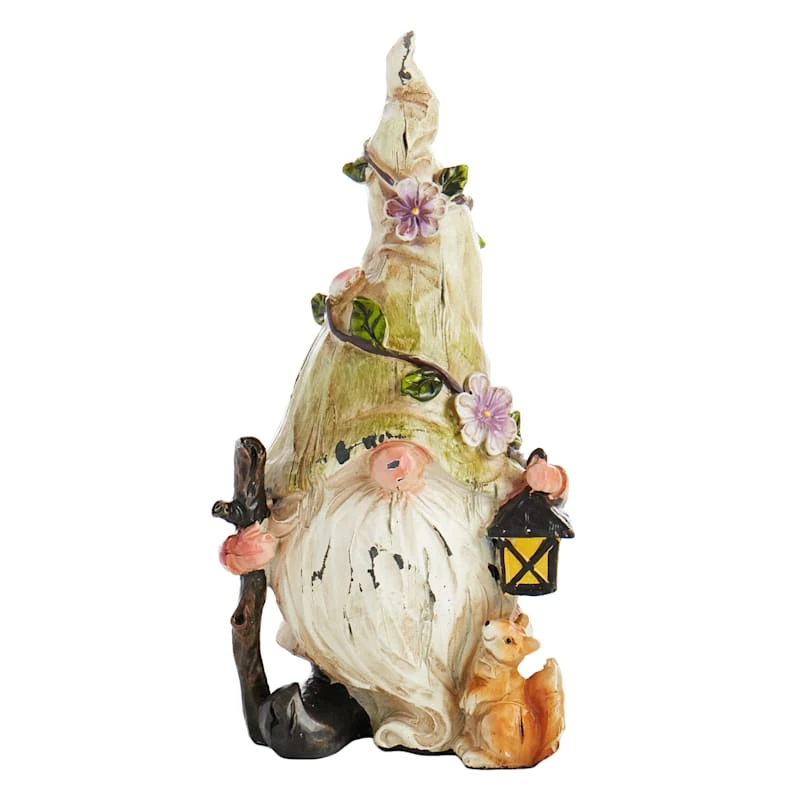 Our resin green hat gnome is the perfect garden decoration for whimsy lovers. This fun figurine features a colorful painted finish, and the gnome holds a lantern and stick and is accompanied by a friendly squirrel ready to bring some shenanigans to the garden. With the brightly colored sculpted resin details, this statue adds a touch of personality and excitement to any outdoor space.