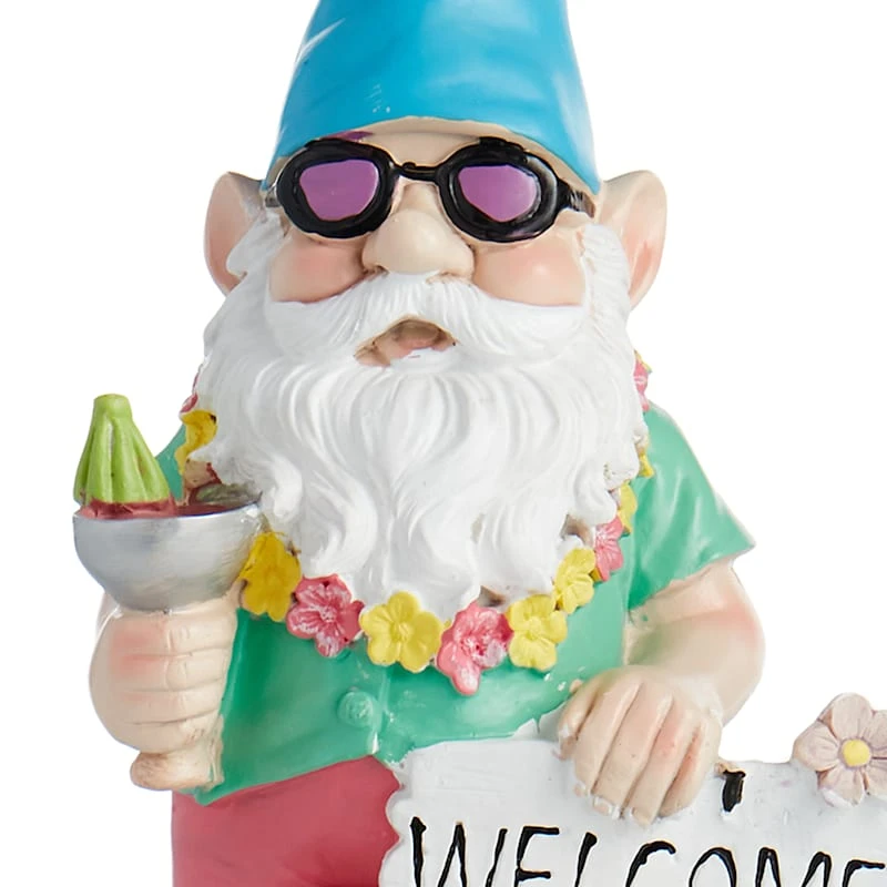 Wow your family and friends with our charming resin �Welcome� garden gnome with blue hat and flip flops who looks like he�s straight out of a children�s fairytale. The colorful detailing of this figurine draws you in, and it�ll be a welcome addition to your prolific garden for years to come.