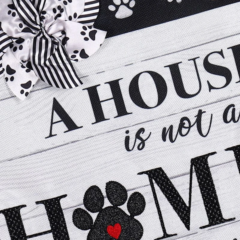 Welcome visitors into your home with our fun “A House is not a Home without paw prints” garden flag. Featuring a black and white outdoor motif, this welcome sign is a great way to greet your guests. The wonderful tonal paw print and bow detailing is a nice pop to help get the warm days ahead started. This is the perfect spring or summer decoration to welcome in the new season and guests, too.