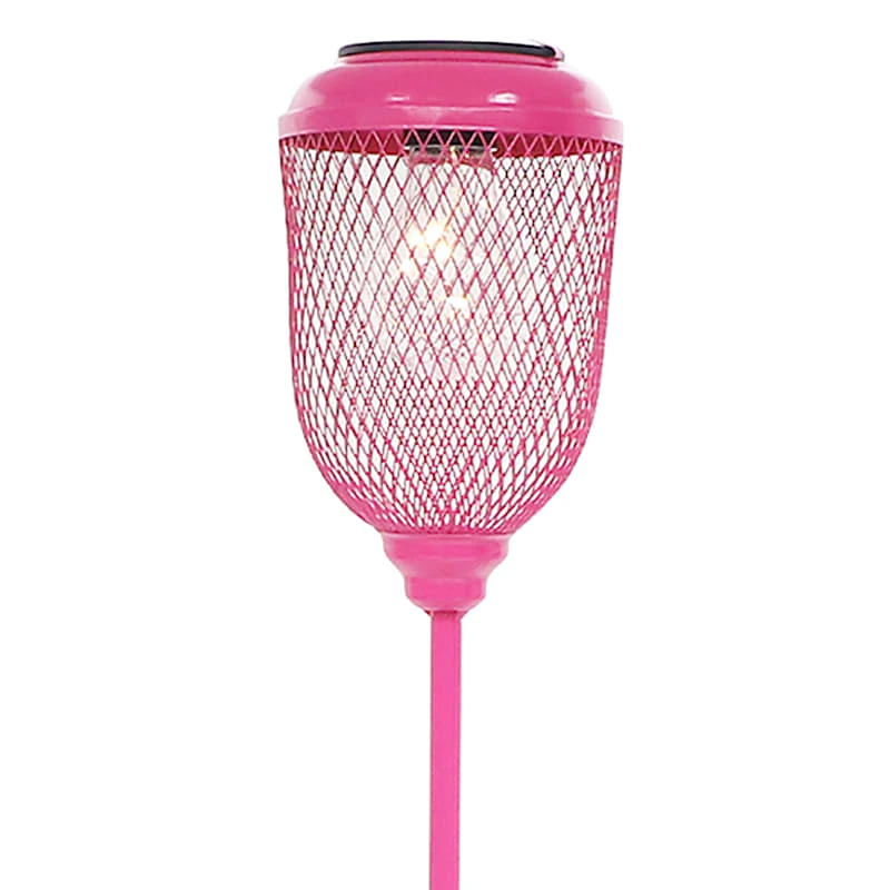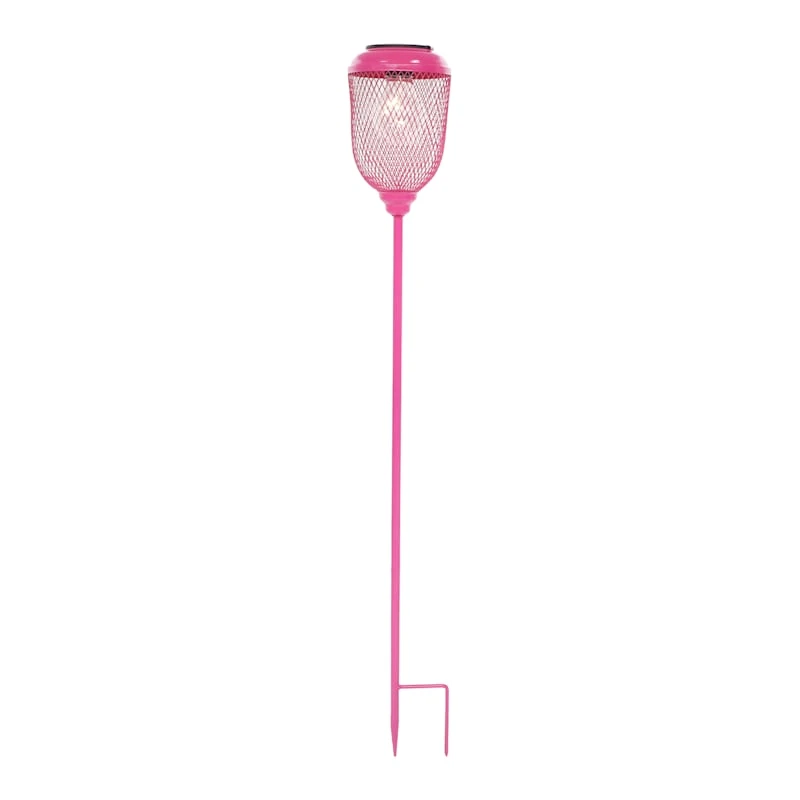 Add a pinch of fun to your garden with our colorful pink metal 32in. caged LED decorative lantern outdoor garden stake. Created with love, this detailed metal piece features a double spike base with a detailed light fixture design. Everyone will enjoy the charming subject matter tucked into your prolific garden. Made of rust-resistant metal, this garden stake is designed to bring an illuminated touch to your landscaping.