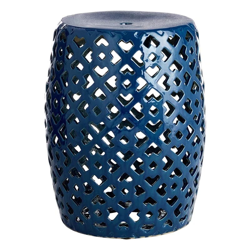 A collection that lets everyone relax in style. Polished finishes and classic hues pair with fun finds. Providence is where elegant settings still feel comfortable and warm—exclusively At Home. Our 18in. handy blue ceramic lattice garden stool works as a spare seat to in your garden room or patio, or it’s the perfect place to set your drink and nibbles while visiting. Made from ceramic with a barrel silhouette and open cutout motif. The stand is finished with a glossy blue hue that’s sure to draw attention.