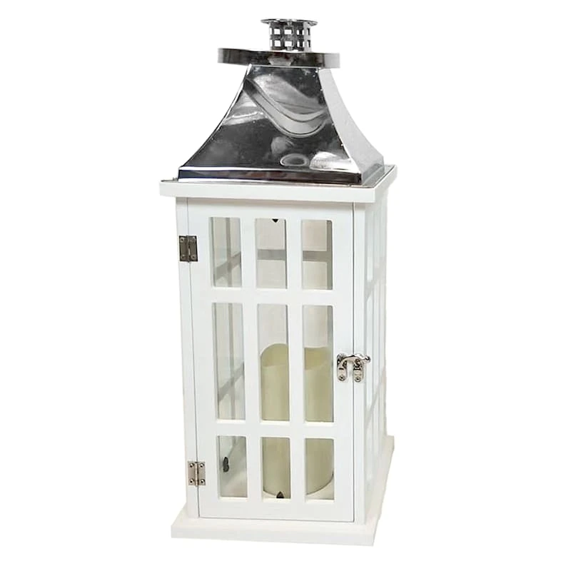 A collection that lets everyone relax in style. Polished finishes and classic hues pair with fun finds. Providence is where elegant settings still feel comfortable and warm—exclusively At Home. This 20in. white chrome accent outdoor LED lantern is the perfect addition to any home decor, inside or out. The flickering LED pillar candle lamp lights from within and adds to the overall ambience. The flexible handle makes it easy to hang from any hook, or it can also be set on the hearth, bookshelf or on the patio table, too.