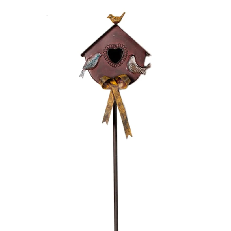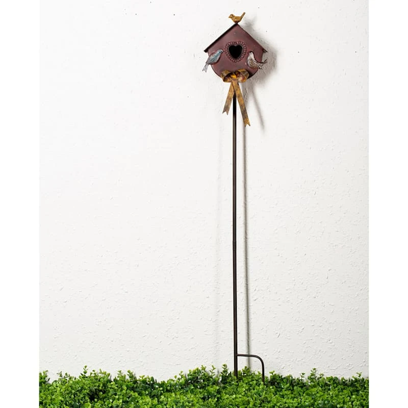 Add a pinch of fun to your garden with our rustic metal birdhouse garden stake. Created with love, this detailed metal decor features a pole base with a red birdhouse, bird and bow motif. Everyone will enjoy the charming birdhouse tucked into your prolific garden. Made of rust-resistant metal.