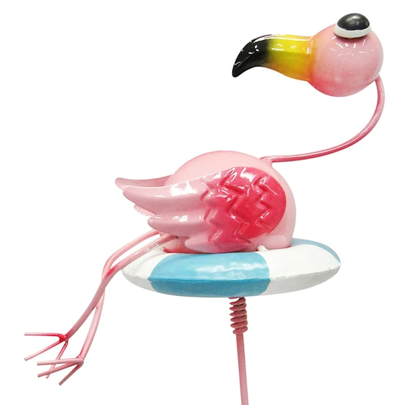 Our colorful pink metal swimming flamingo garden stake is the perfect decoration for lovers of whimsy. This kinetic spinner features a lower spring mechanism that lets the flamingo sway and bobble in the wind. With brightly colored painted metal details, this fun garden stake adds a touch of personality and motion to any outdoor space.