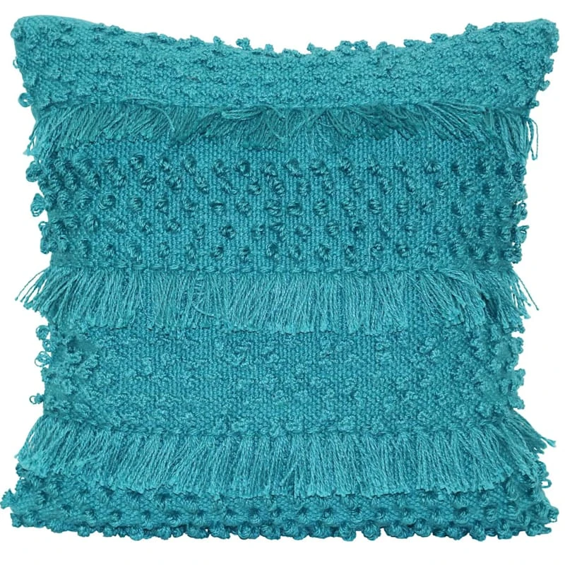 A jack of all trades, including graphic designer, carpenter, contractor, author and beloved reality TV host, Ty Pennington has curated a new and exclusive collection for At Home. Featuring a global-inspired design, our aqua knotted rug pillow is brimming with loads of exotic charm. The brilliant aqua fabric boasts a knotted motif with eclectic alternating color fringe detail. A unique throw pillow like this helps you create an instant refresh with ease.