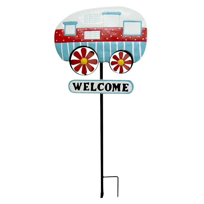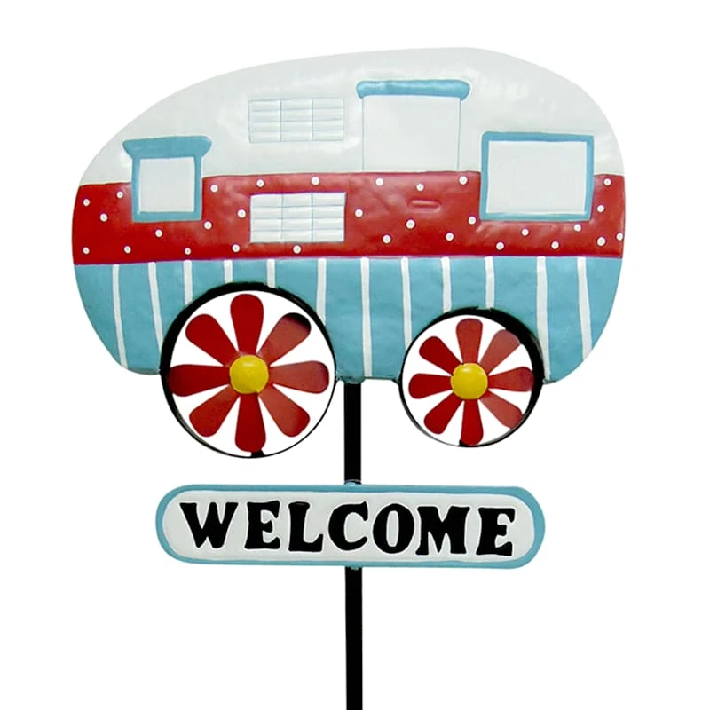 Add bright whimsy to your yard with our retro camper welcome sign. The wheels feature a fun floral design and look as if they’re moving in the breeze. Stakes easily into the ground anywhere in your yard or garden, or you can add it to a grouping of flower pots for an even more spectacular display.