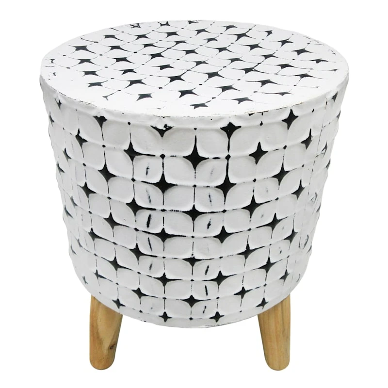 Give your plants a fun spot to hang out with our round white and black embossed metal plant stand. Featuring a cool cylindrical design and wooden feet, this piece will be right at home inside or out. Whether setting up a garden room, or simply looking to save a plant from the chilly outdoors, this stand is a great option for ornamenting your home.