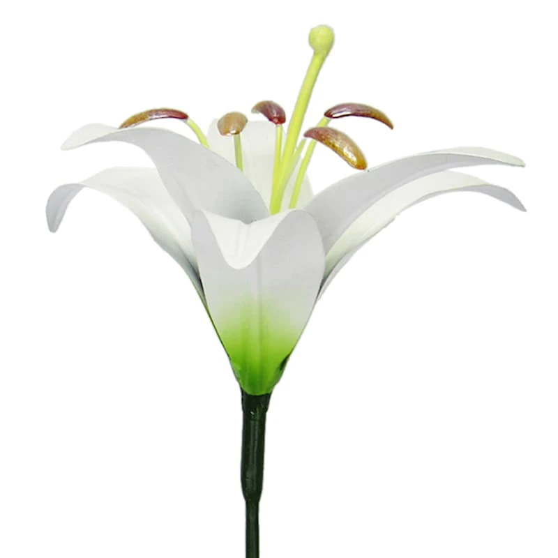 Add a pinch of fun to your garden with our colorful metal 32in. white lily garden stake. Created with love, this detailed metal piece features a pointed spike with a detailed flower and leaf design. Everyone will enjoy the charming subject matter tucked into your prolific garden. Made of painted white, and green rust-resistant metal, this garden stake is designed to bring a natural touch to your landscaping.