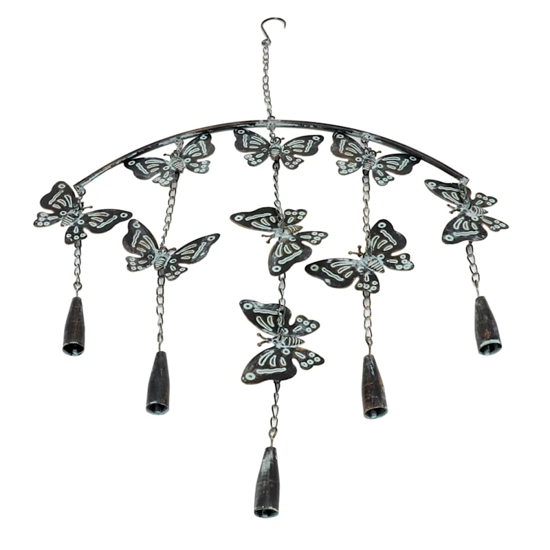 Beautiful and whimsical butterflies adorn our arched weathered metal wind chime, which creates a clear and graceful sound. Wind chimes are symbolic of serenity and tranquility and are also thought to bring luck to whomever listens to them. The perfect gift for the butterfly lover.