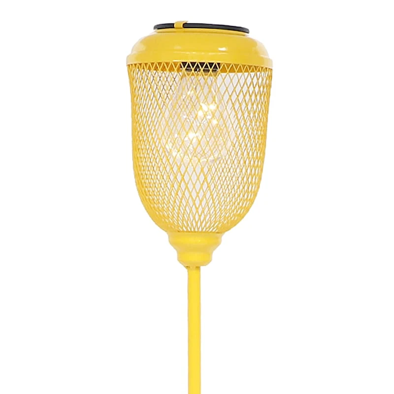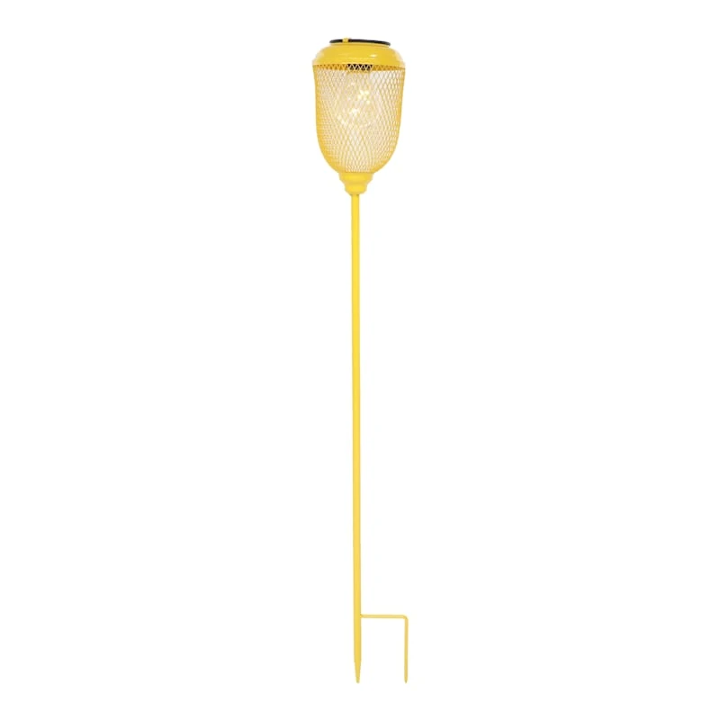 Add a pinch of fun to your garden with our colorful yellow metal 32in. caged LED decorative lantern outdoor garden stake. Created with love, this detailed metal piece features a double spike base with a detailed light fixture design. Everyone will enjoy the charming subject matter tucked into your prolific garden. Made of rust-resistant metal, this garden stake is designed to bring an illuminated touch to your landscaping.